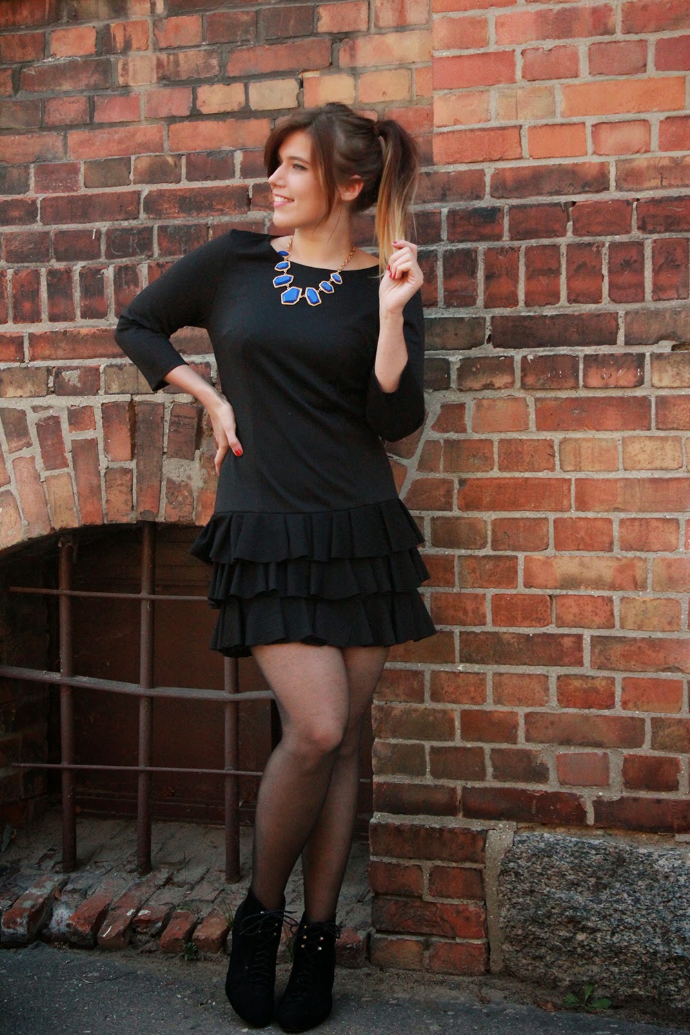 Do tej sukienki użyłam kawałek eko skóry, który ułożyłam w równe zakładki. Przykryłam miejsce wszycia delikatną, skrojoną z koła falbanką.