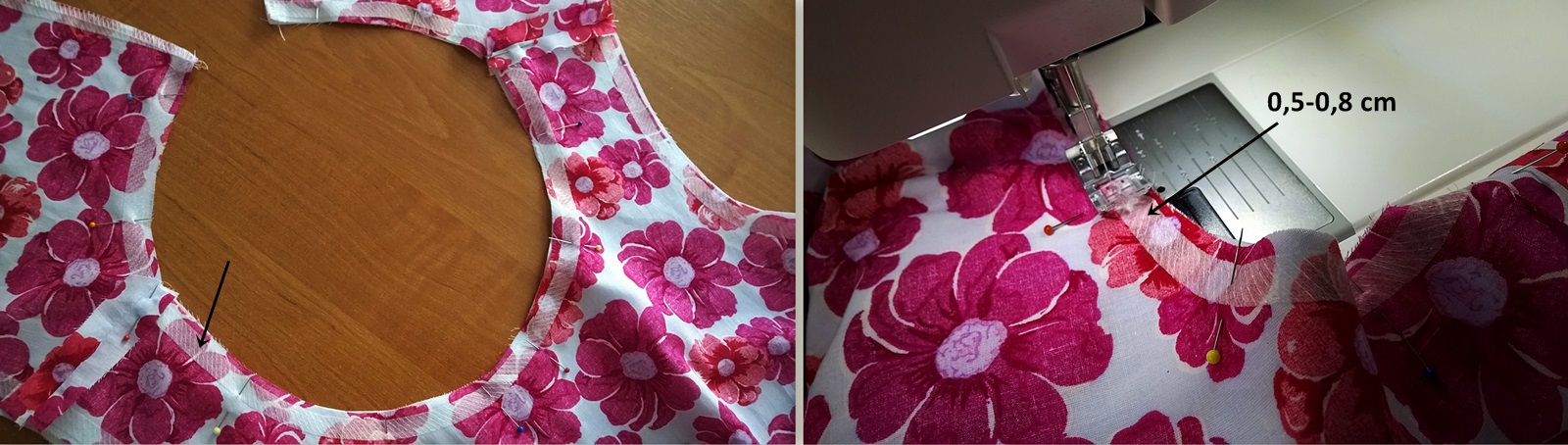 Ponownie przewracam całość na lewa stronę, mam pewność, że podszewka i tkanina są równe, więc moge spinać szpilkami do odszycia pachy. Teraz spinając podszewkę z wierzchem sukienki delikatnie wysuwam podszewkę na jakieś 1-2 mm, zszywam i nacinam na całej długości.