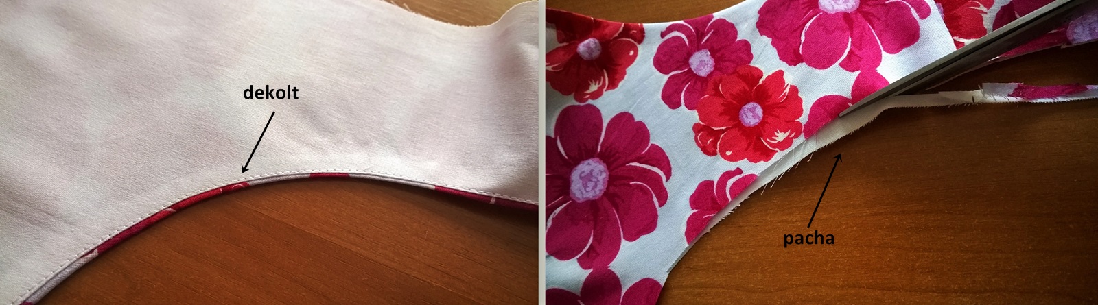 Po ostębnowaniu przyprasowuje cały dekolt dookoła, jak widzicie delikatnie chowam podszewkę, teraz po stronie wykończenia pachy sprawdzam i wycinam nadmiary, materiał musi pokrywać się równo z podszewką.