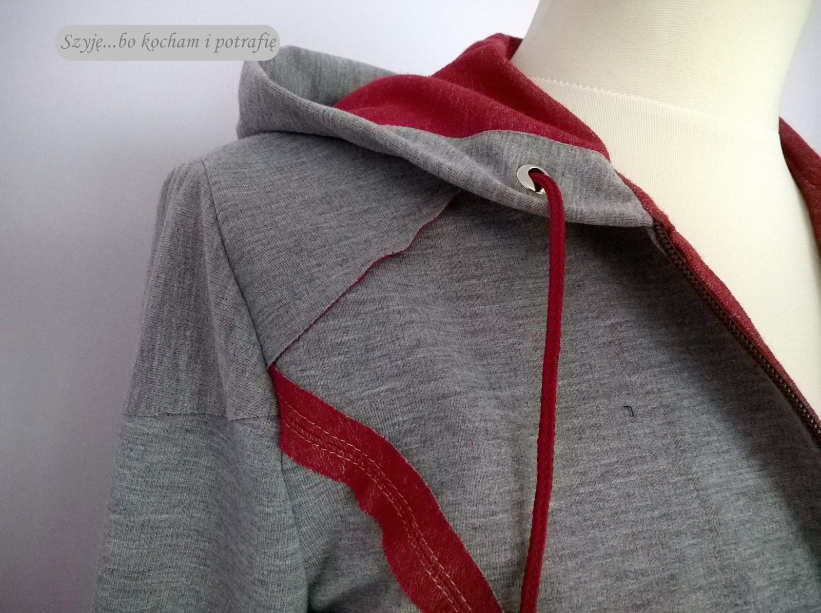 Raz, że oryginalne te szwy widoczne na prawej, dwa, że fajny dobór kolorystyki – szarości do bordo. Rzeczywiście taką zwykłą- niezwykłą bluzę warto mieć w szafie. Na chłodne wieczory w ogrodzie/ na balkonie, na wyprawy w nieznane. No zawsze się przyda. Ja przykładowo sprawiłam sobie taką bluzę, ciepluchną, ale całkowicie przypadkowo. Szyłam mianowicie dla męża, ale okazała się za krótka, więc nie było innego jak uszyć dla męża nową, dłuższą , a sama -po odpowiednim wytaliowaniu 😉 sprawiłam sobie nową sportową sztukę w szafie 🙂