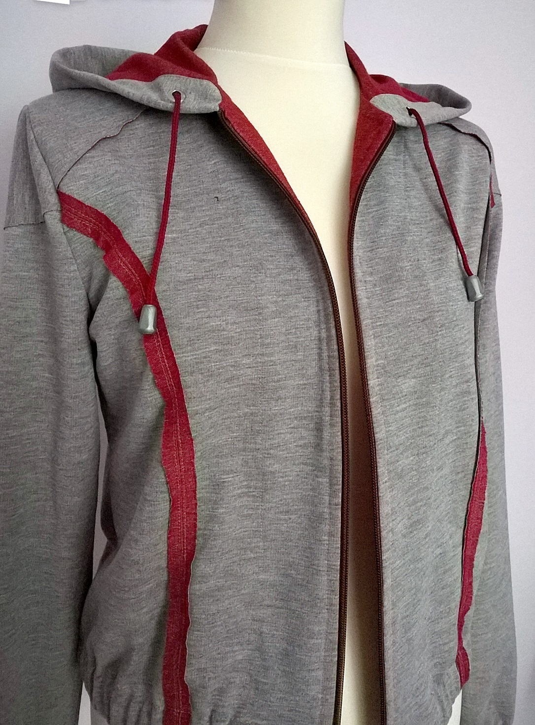 No pomysł na bluzę przedni! Jak mi się te bordowe brzegi po prawej stronie podobają! A jakie równiutkie. Ręka Ci nie drżała, jak wycinałaś? Mi by drżała, zwłaszcza na łukach :). Ze zwykłego sportowego ciucha zrobiłaś bardzo oryginalne odzienie. Podziwiam staranne wykończenie, i choć u Ciebie to standard, to lubię zawsze o tym napisać :).