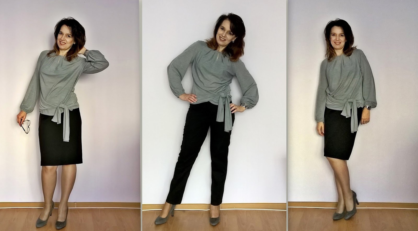 Bluzka z wiązaniem wykrój 105 Burda 11/2016. Uszyta z takiej samej dzianiny jak wyżej.