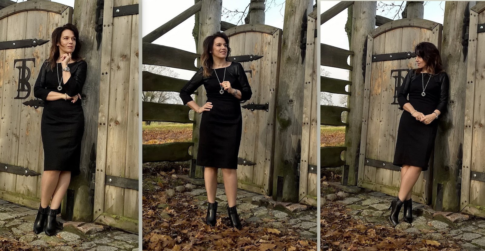 Czarna sukienka ze skórzanymi wstawkami, tkanina kupiona TU. Wykrój 124 z Burdy 8/2015.