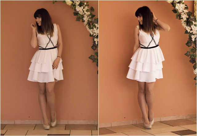 3. Sukienka biała z ozdobna aplikacja i asymetrycznymi falbanami, prosta, bezpretensjonalna i dobra na każdą okazję.