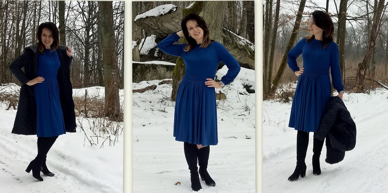 Nie, nie podążam ślepo za tegorocznymi kolorystycznymi trendami. Jakoś tak wyszło, kolor niebieski i wszelkie jego odcienie urzekają mnie ostatnio i w mojej szafie już jest i jeszcze trochę pojawi się w tym kolorze. Co do samej sukienki a raczej formy na tęże sukienkę, była w moim grafiku szyciowym, chociaż nie znałam jeszcze dokładnej daty jej powstania. Początkowo myślałam, że trzeba będzie się trochę przy niej pobawić. Ale jakież było moje zdziwienie, jak okazało się, że sukienkę uszyłam nawet nie wiem kiedy. Wbrew pozorom sukienka jest bardzo prosta do uszycia. Wykorzystałam dzianinę typu JERSEY kupioną w Natanie. Zmiany jakie wprowadziłam to skrócenie góry sukienki nad paskiem o jakieś 2 cm (wykrój jest dla osób wysokich) ja co prawda mam 1,69 ale i tak pas wypadał mi lekko na biodrach. Zamiast zamaszystych rękawów, za którymi tak do końca nie przepadam, zrobiłam proste, zebrane w tunel z gumką. Cieszę, się, że uszyłam ją teraz i właśnie z tej dzianiny, nie dość, że wygodna to spokojnie mogę już ją nosić, bo moim zdaniem świetnie wygląda do kozaków. Taki fason, świetnie sprawdza się na co dzień, sukienka jest niezobowiązująca i możemy nosić ja prawie wszędzie, a takich w szafie potrzeba najwięcej.