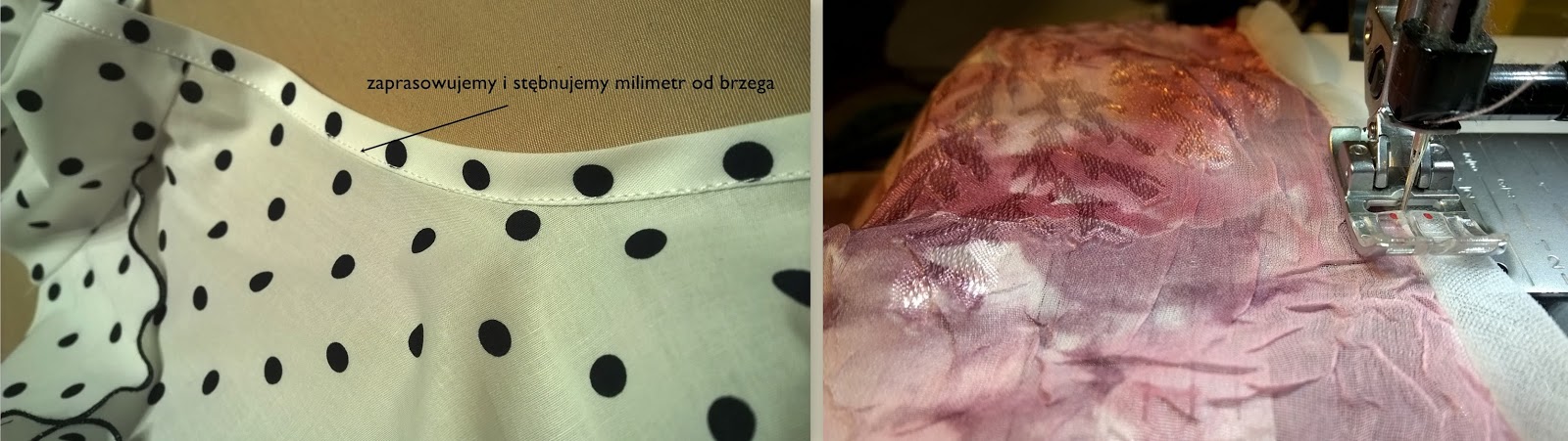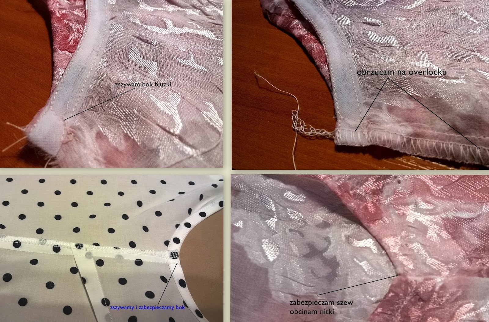 W tym poście wykorzystałam dwa rodzaje zdjęć, podczas szycia dwóch różnych bluzek, żeby lepiej pokazać wszystkie czynności. Jedna z bluzek (ta w groszki) odszyta jest lamówką z tej samej tkaniny, druga odszyta elastycznym tiulem. Dla zainteresowanych bluzką: bluzka ma bardzo prosty fason, z zaszewką na biuście, w dole tunel z cienką gumką, przy dekolcie, wszyta szarfa po kilkukrotnym złożeniu.