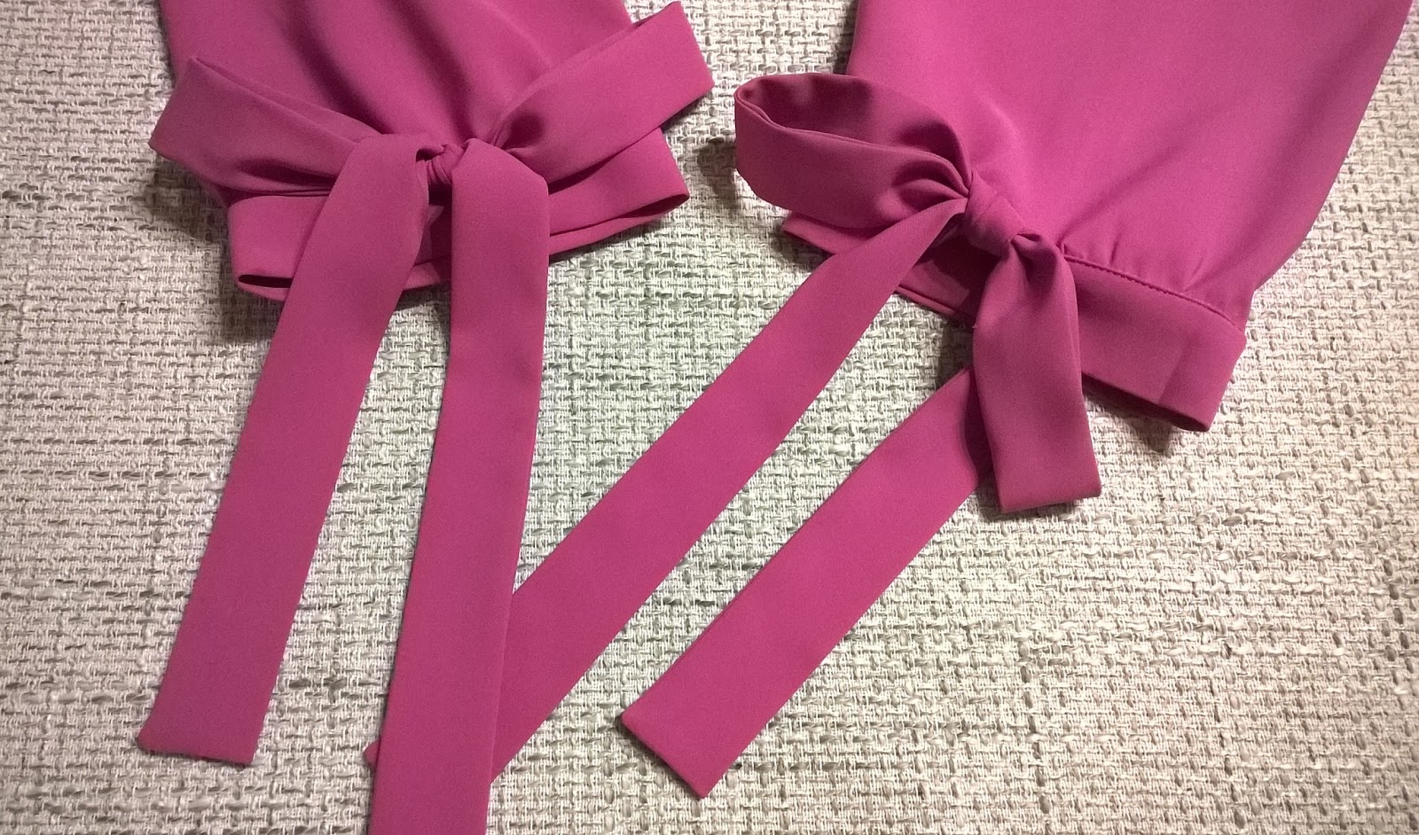 Bardzo prosta rzecz w wykonaniu a może przynieść fajny efekt. Wiązania bardzo lubię i to chyba w każdym możliwym miejscu, oby tylko nie były kłopotliwe w użytkowaniu. Przyznam, że z wiązaniami bardziej mi po drodze niż falbankami, które teraz są wszechobecne. Kiedy zaczęłam szyć kolejną rzecz, (której na razie nie zdradzę) pomyślałam, czemu by nie wykończyć rękawów w taki fikuśny sposób. Jak pomyślałam tak tez zrobiłam, przyznam, że wygląda to bardzo fajnie a co najważniejsze, szyje się niezwykle szybko.