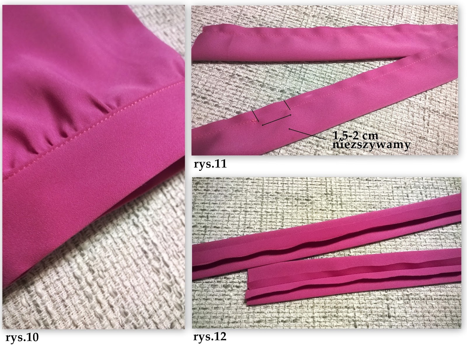 rys.11 teraz bierzemy się za odszycie pasków na wiązanie, moje mają 80 cm długości i 6,5 cm szerokości, przeszywamy wzdłuż na szerokość połowy stopki od brzegu zostawiając mały wlot 1,5-2 cm (będzie to nasze miejsce na wywrócenie paska)