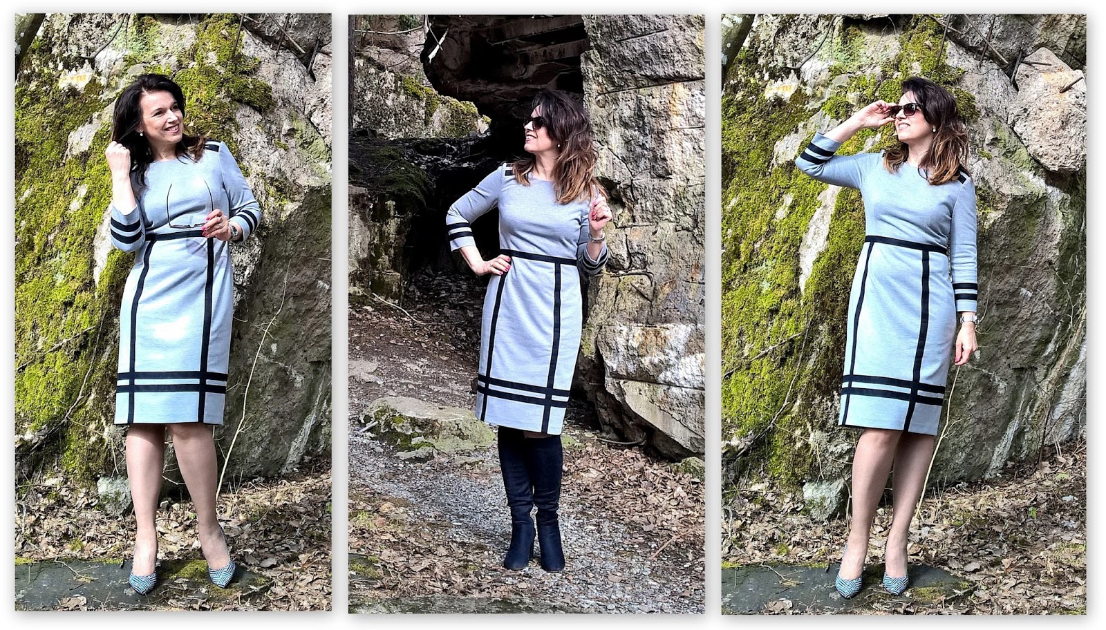 Naszyłam w kilku miejscach i efekt, jest zadowalający. Sukienka na pewno teraz wyróżnia się z tłumu innych szarych sukienek, i tylko przez naszycie prostej taśmy. Równie dobrze można zastosować tu inne taśmy: rypsowe świetnie się sprawdzają, czy też lamówka zaprasowana, ale tu polecam te nieco sztywniejsze, te miękkie będą się falować po jakimś czasie (wiem bo sprawdziłam).