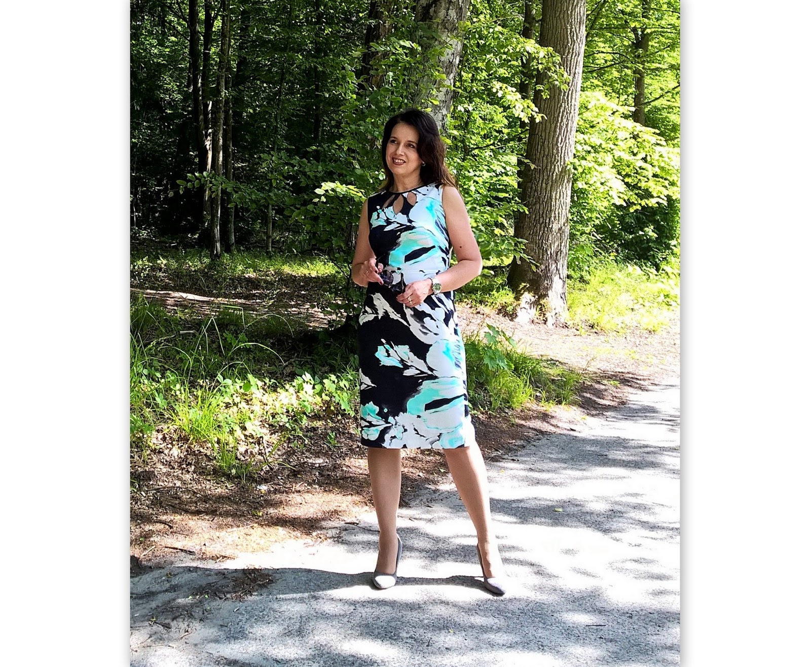 Tkaniny mają piękne, malarskie barwy i wzory, ale moim zdaniem trzeba sporo wyobraźni by w nich zobaczyć efekt końcowy a jest on wspaniały 🙂 Rewelacyjnie rozwiązałaś kwestię wycięć na dekolcie, to było coś co mnie do tego fasonu zniechęcało 🙂 Super w nich wyglądasz 🙂 Pozdrawiam 🙂