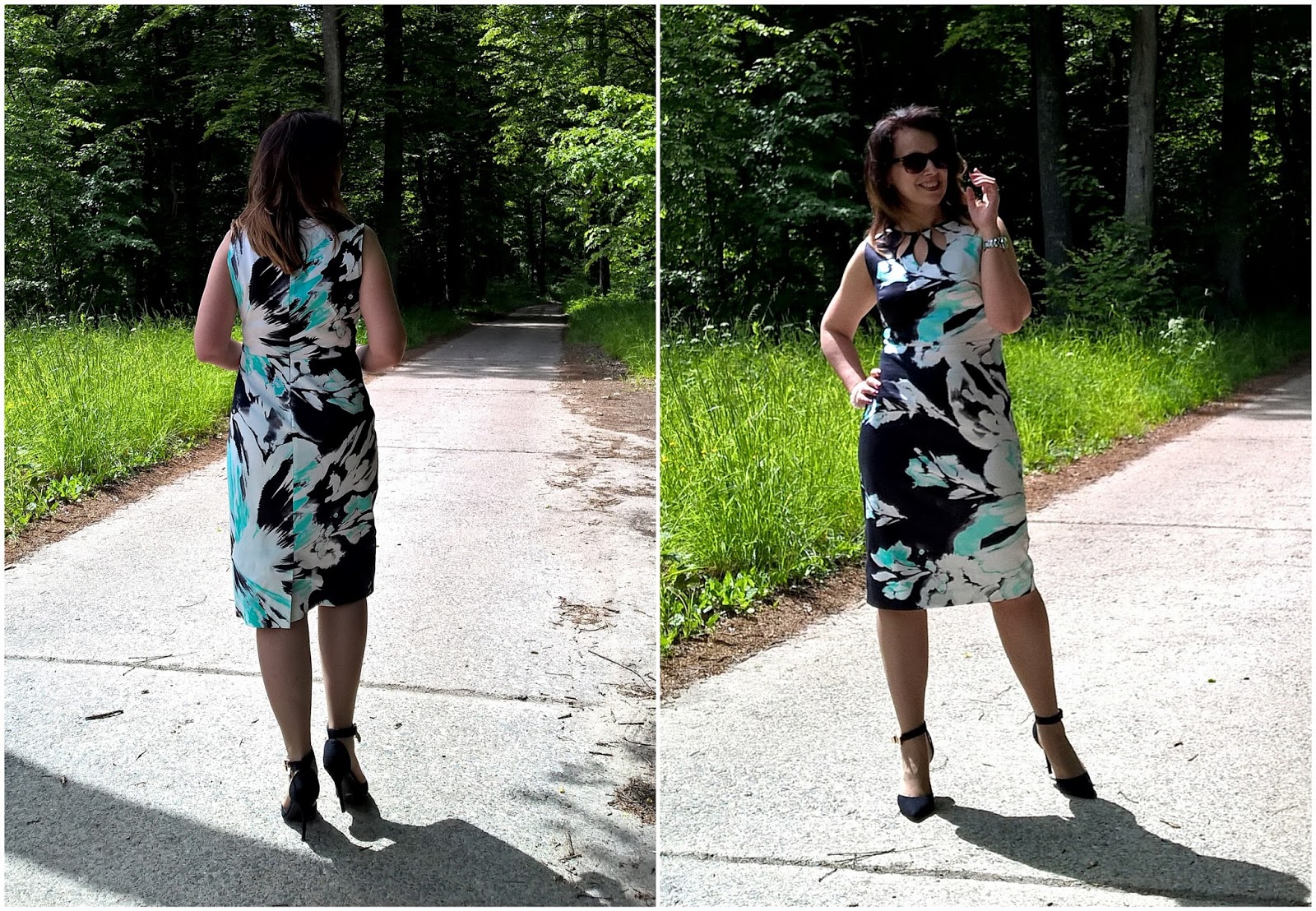 Najpierw oczywiście była tkanina. Pierwsza wpadła mi w oko w róże, kiedy ją zobaczyłam, nie mogłam się jej oprzeć, kupiłam od razu. Wiedziałam, że taki słodziaszczy wzór w róże świetnie sprawdzi się w sukience. Później zobaczyłam kolejną TKANINĘ w NATANIE takie nieoczywiste rozmazane kwiaty, i też wsiąkłam, podobał mi się wzór i kolorystyka tej tkaniny, czarne tło i biało – miętowe kwiaty. Jednego byłam pewna, że sukienki będą proste i dopasowane. Nad wykrojem specjalnie się nie zastanawiałam. Jedyne co je miało różnić to coś na dekolcie. W oryginale są duże owalne wycięcia (nie mam nic przeciwko łezkom) ale wolę chyba jednak troszkę inny kształt, więc na sukience w róże jest jedno poszerzone wycięcie, połączone paseczkiem na samej górze, natomiast w mazanej narysowałam sobie trzy łezki, ale bardziej przypominające listki, tak podoba mi się bardziej.