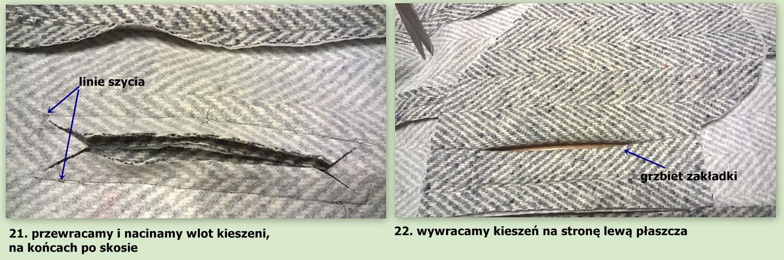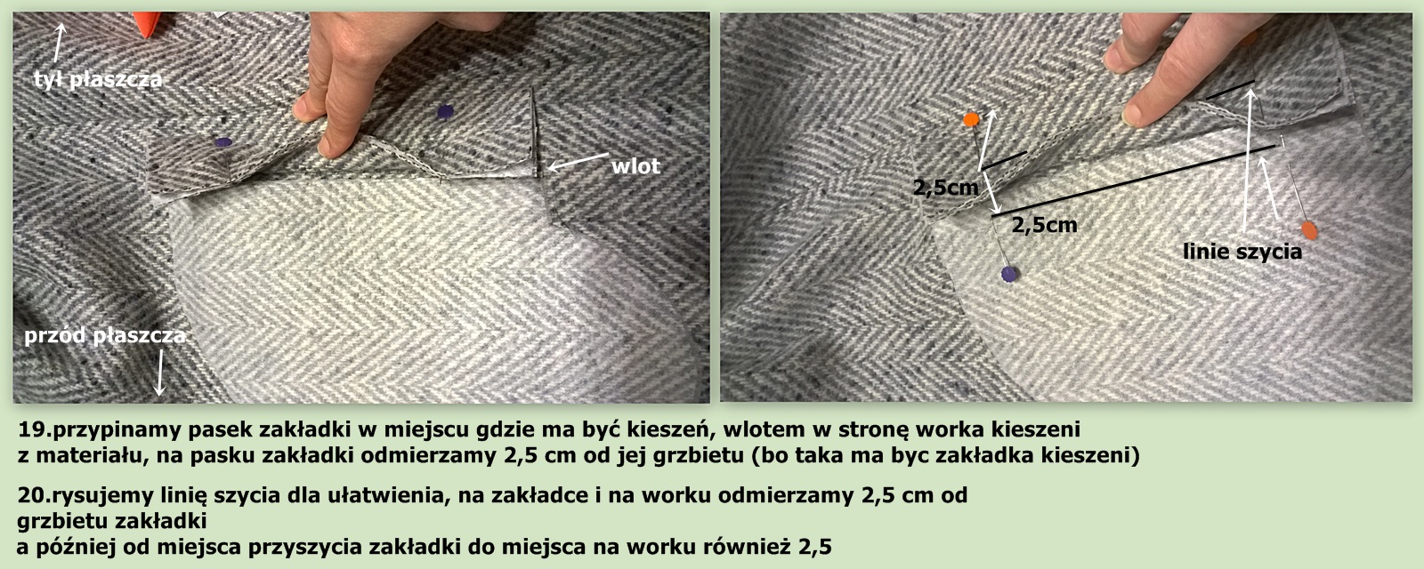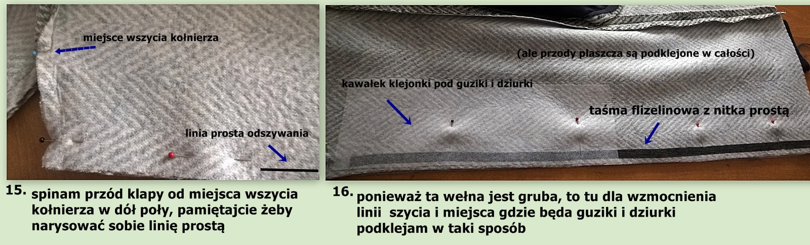 Nie są tak naprawdę czymś trudnym do uszycia. Dziś pokażę pierwszy sposób, moim zdaniem łatwiejszy. Dla lepszego efektu podklejam worki kieszeni z tkaniny, nie musicie ich podklejać w całości, ale np, tylko sam brzeg, który będzie przyszyty do części płaszcza, zakładki podklejam w całości, zwróćcie uwagę przy klejeniu klejonki/flizeliny aby przykleić ją w taki sposób by po długości zakładka była stabilna bo później w użytkowaniu płaszcza może się prostu rozciągnąć, i kieszeń będzie brzydko odstawać.