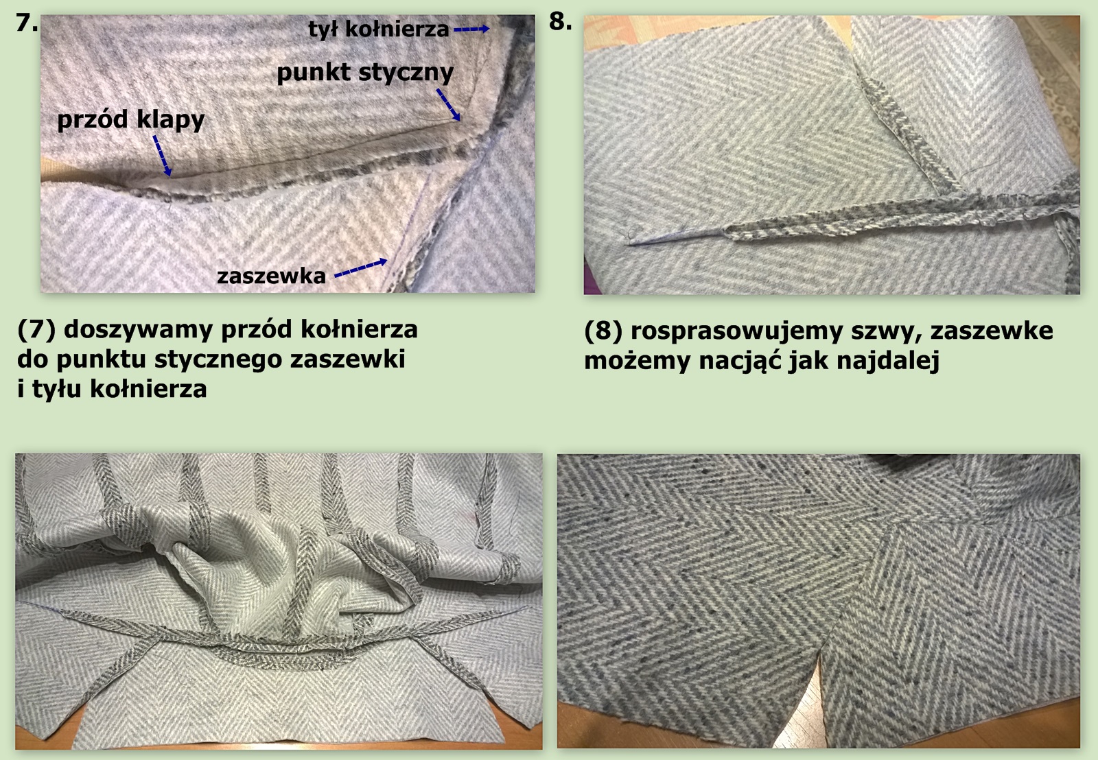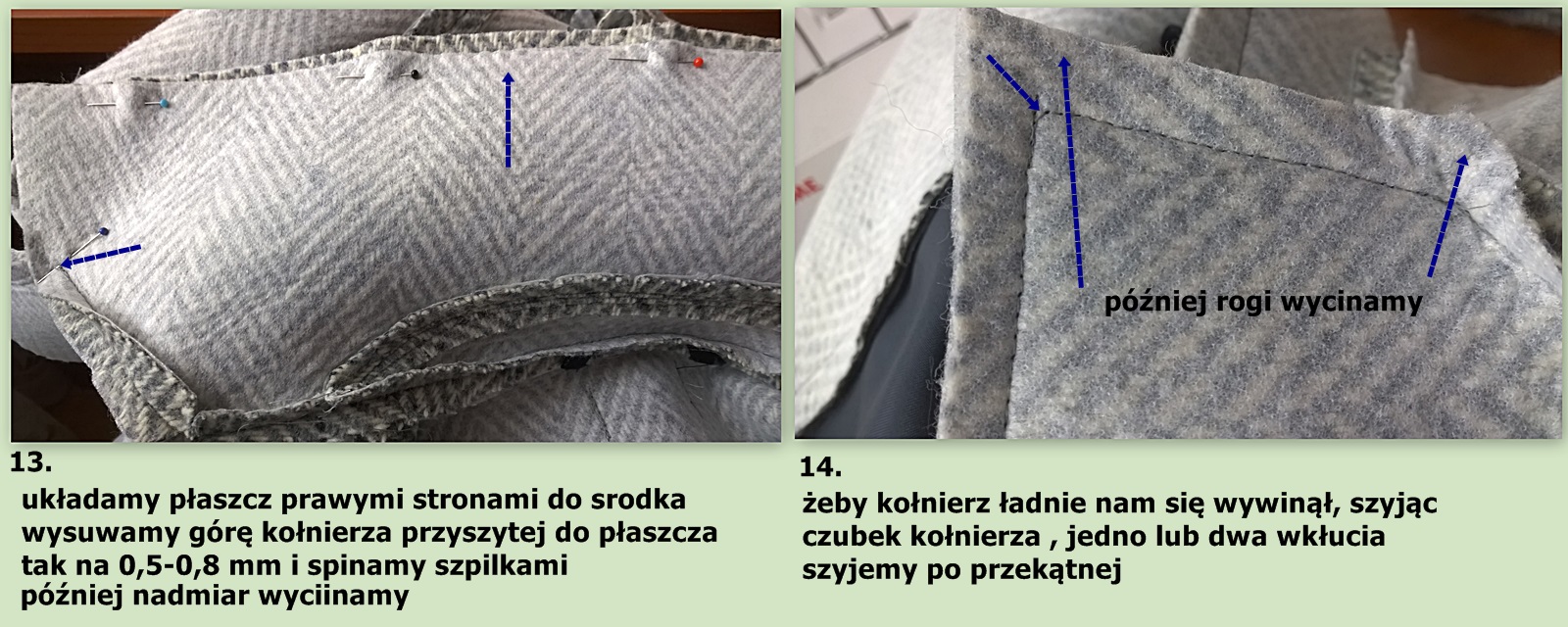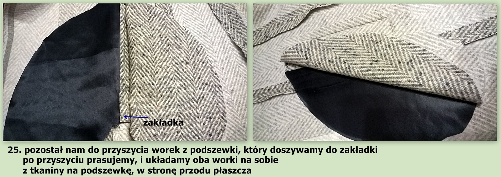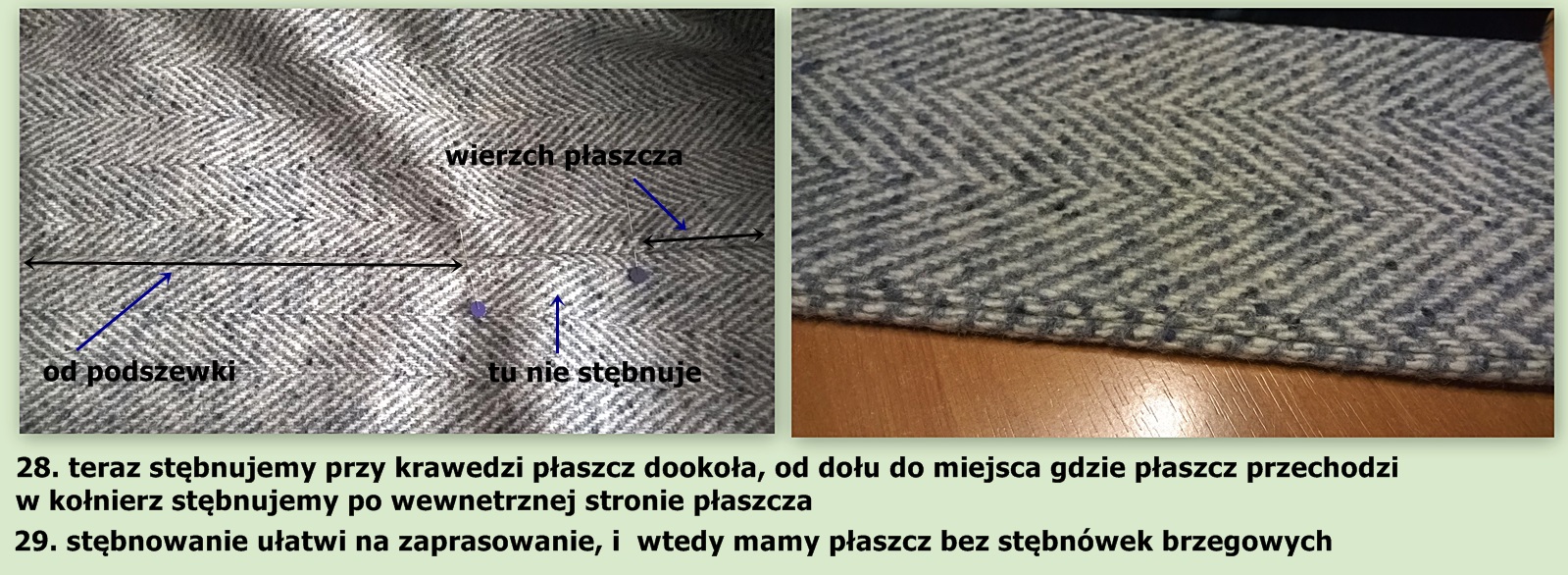 2. jak podłożyć płaszcz na przodach dołów, kiedy zastosujemy stębnowanie brzegów przy szwie.