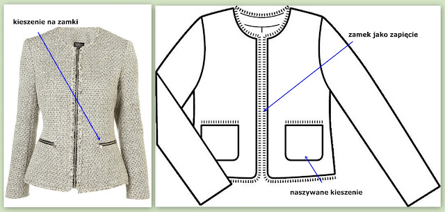 5.Żakiet zapinany na zamek + kieszenie zapinane na zamek i kieszenie naszywane. Uwielbiam zamki, natomiast nienawidzę haftek, te pasują mi chyba tylko w bieliźnie. Zamki stanowią bardzo efektowny element, mogą służyć i jako zapięcie ale też jako element ozdoby, z przodu i w kieszeniach, chociaż rozdzielając taśmę zamka, można stworzyć tez niebanalną ozdobę niektórych kreacji, może uda się coś pokazać w tym kierunku. Świetnie wyglądają też naszywane kieszenie, które mogą stanowić piękne dopełnienie żakietu, a jeszcze dodatkowo jak je w jakiś sposób ozdobimy, to staną się wisienką na torcie na bardzo prostym żakiecie.
